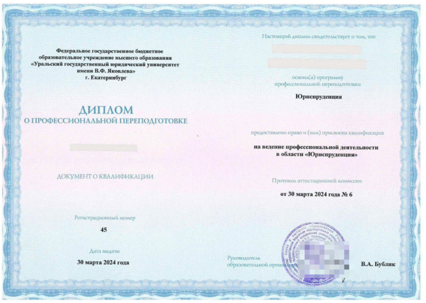 По окончанию онлайн курса Вы получите Диплом о профессиональной переподготовке УрГЮУ им. В.Ф. Яковлева, зарегистрированный в реестре документов об образовании Министерства науки и высшего образования РФ (ФИС ФРДО).